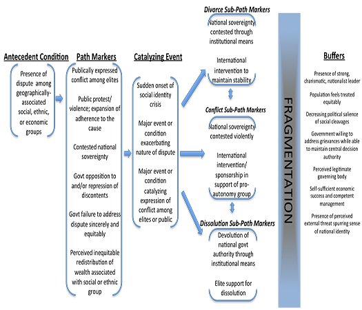NSI conducted a “fragmentation” analysis with the focus being to answer the question what path is Pakistan on. This is an extremely difficult question to answer and leads to an answer that is too static to be reasonable or too long. This is because at any point in time we might observe in a state such as Pakistan, evidence consistent with any number of future pathways. For this reason our approach was to look at where the balance of the evidence lies – which might be the dominant path – and more crucially, which are the indications and warnings that we should be looking out for in order to understand day-to-day in Pakistan in terms of what they say about movement along one path or the other. Our basic approach was to utilize techniques from our human behavior analytics to first start with theoretical propositions about the nature of the pathways, we then tested these against historical cases used to refine our path characterizations, and finally we applied the refined paths to look at Pakistan from today forward. The general pathway descriptions we have constructed are not just applicable to Pakistan but could as easily applied to assess for example, where Turkey is relative to fragmentation, or whether Afghanistan is moving forward or slipping backward in terms of political, economic and social development.