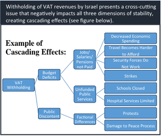 We decomposed this into three questions for the WB-StaM to address: What are the factors that most significantly contribute to governing, economic, and social stability in the West Bank? Are there factors, commonly associated with stability, that have no effect or divergent effects on stability in the West Bank? and What are the primary effect dependencies among factors? The WB-StaM examined multiple factors to illuminate the economic, social, and political stressors (instability drivers) that lead to instability, as well as the economic, social, and governing capacities for resilience (stability buffers). Key findings from our WB-StaM analysis, include: VAT withholdings and declining foreign aid are causing a cascade of impacts that are crushing the economy, undermining the legitimacy and capacity of the PA, and impairing basic human rights and needs; political stalemate on the West Bank degrades perception of PA legitimacy, while the PASF is feared and seen as working with the IDF and violating human rights; high youth unemployment and inappropriate job training, coupled with a climate of conflict, could lead to uprisings among younger Palestinians; and increased limits on protests and speech further a growing discontent and risk retaliatory actions.